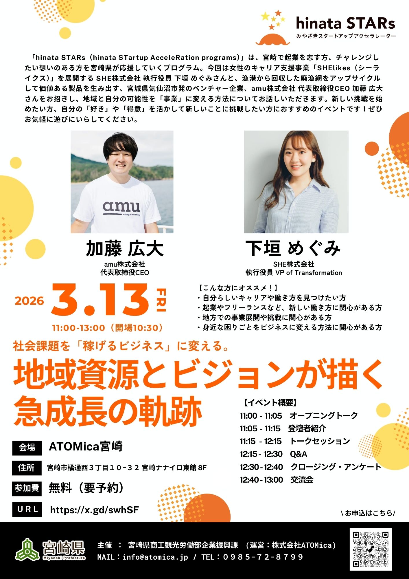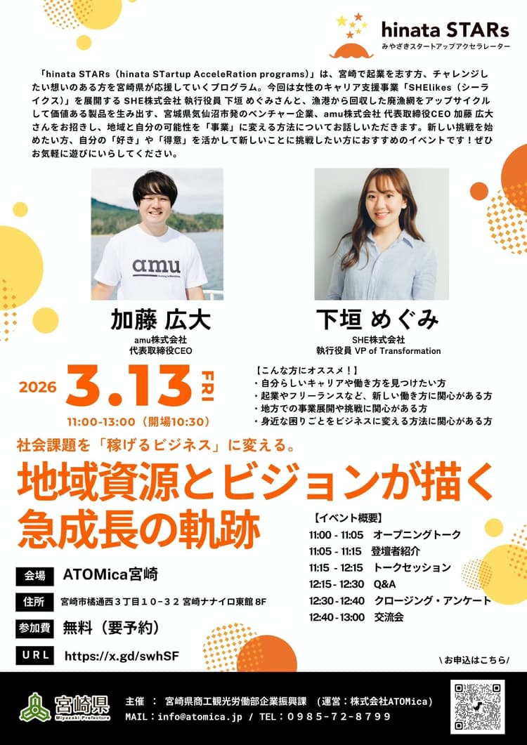 今回、宮崎県が主催する「hinata STARS (hinata STartup Accele Ration programs)」の一環として、地域資源や個人の「好き」や「得意」を価値ある事業へと昇華させるためのヒントを探るトークセッションを実施します。