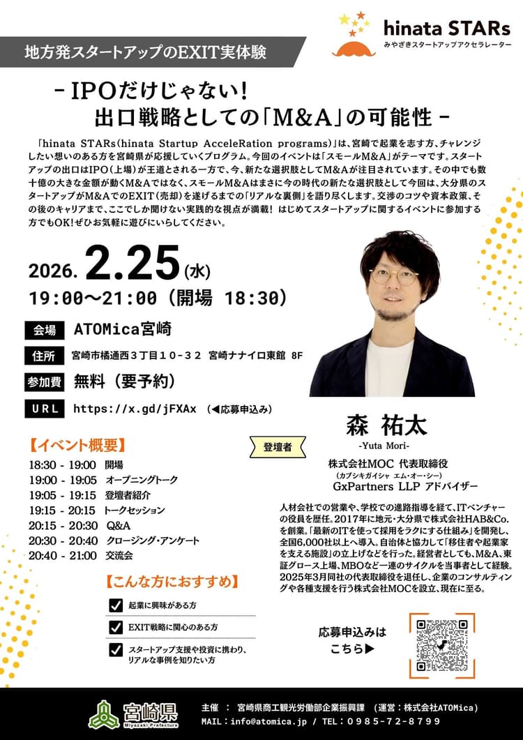 大分県のスタートアップがM&AでのEXIT(売却)を遂げるまでの「リアルな裏側」を語り尽くす、ここでしか聞けない実践的な視点が満載のイベントです。